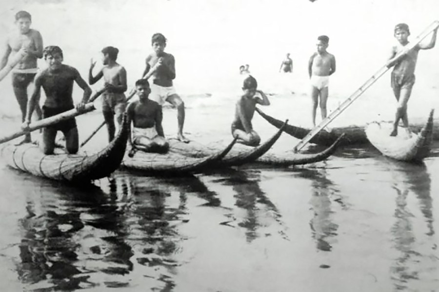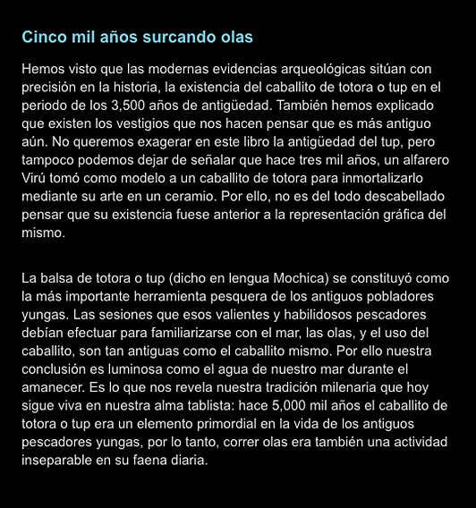 ✅ Hace 5,000 años aproximadamente se surcaban olas en el norte del Perú mediante el ‘Caballito de Totora‘ (conocido como ‘TUP‘ en dialecto moche), nombre que se le atribuye al «primer instrumento unipersonal creado por el hombre para surcar olas». Hubo distintos modelos de ‘Caballitos de Totora‘, uno para pescar y otro para la recreación, este último era usado para surcar olas.
