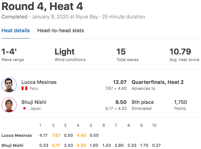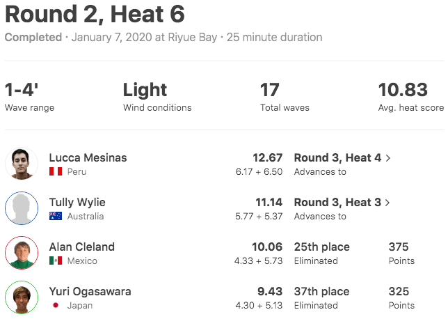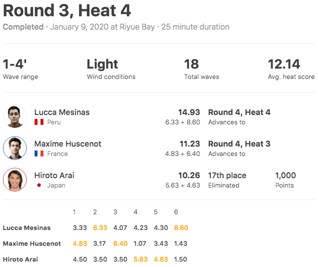 HAINAN 10.ENE 2020 / 1:00 a.m.- En un heat con condiciones de olas regulares (mejores que las de ayer) nuestro representante norteño, Lucca Mesinas, clasifica a la ronda 4 por tercera vez consecutiva en el primer lugar.