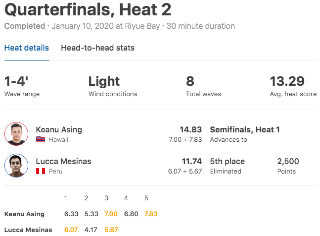 HAINAN 11.ENE 2020 / 11:00 p.m.- En condiciones muy pobres, con olas que llegaban casi al metro de altura, nuestro representante nacional Lucca Mesinas, no logró superar la fase de cuartos de final ante el hawaiano Asing quien terminó sacándole mejor provecho a las pocas olas del heat.