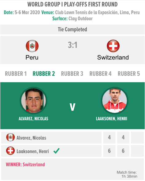 La serie entre Perú y Suiza queda en un empate a 1 en el primer día de competencia. mañana se define el ganador del pase al Grupo Mundial de la Copa Davis con los 3 encuentros restantes, uno por dobles y dos por singles.